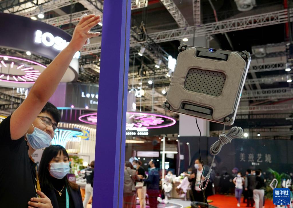11月6日,工作人员在进博会的展馆里讲解擦窗机器人的工作原理。