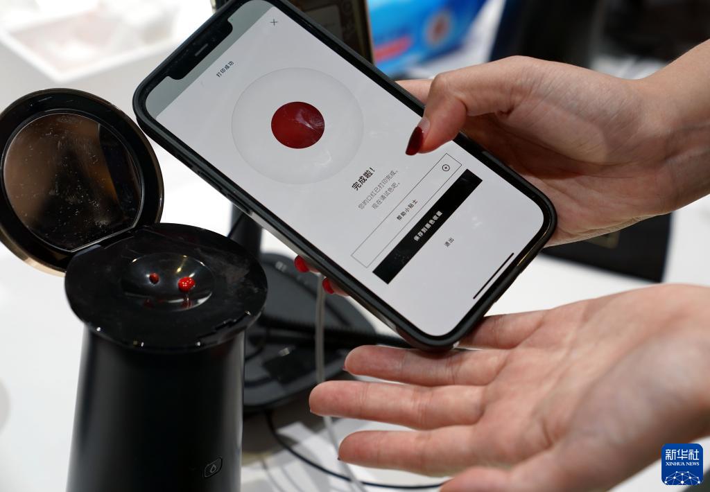 11月6日,在进博会欧莱雅展台拍摄的通过手机App操作实现个性化调色和取色的“口红打印机”。
