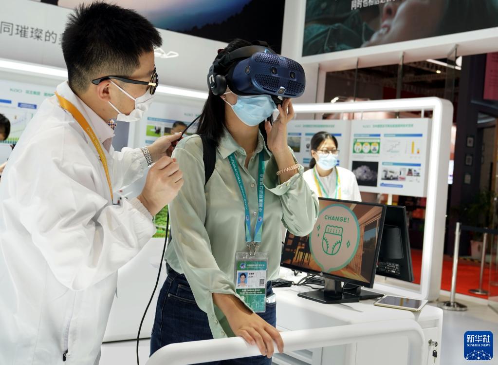 11月6日,参观者在进博会一处展台通过VR设备体验婴幼儿穿着纸尿裤行走时的感觉。