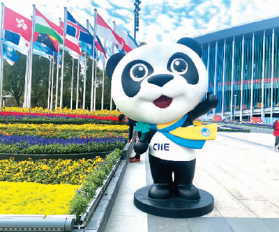 11月4日,第四届中国国际进口博览会在上海开幕。图为展馆外的进博会吉祥物“进宝”。 蒋雨师摄(人民视觉)