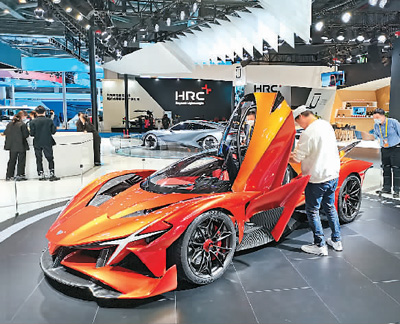 第四届进博会汽车展区内,参观者在力世纪展台参观Apollo超级跑车。人民日报海外版记者 邱海峰摄
