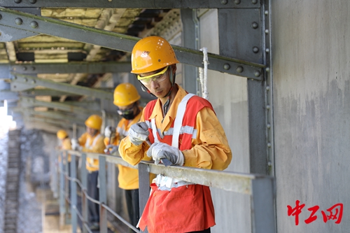 近日,中国铁路南宁局集团有限公司桂林工务段永福路桥机队对毛江桥桥下钢结构局部锈蚀进行除锈油漆及油漆涂装防护作业,及时将设备的微小病害消灭在萌芽状态,为列车行车安全护航。(中国铁路南宁局集团有限公司桂林工务段 李国星)