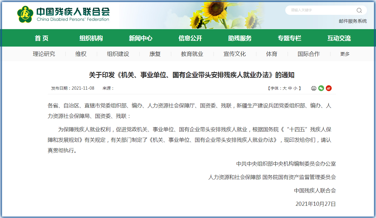 中工网讯 据中国残联网站消息,为推动《“十四五”残疾人保障和发展规划》任务目标落实落地,10月27日,中共中央组织部、中央编办、人力资源和社会保障部、国务院国资委和中国残联五部门共同印发了《机关、事业单位、国有企业带头安排残疾人就业办法》(残联发[2021]51号,以下简称“办法”),“办法”共分六章二十六条,以《公务员法》、《残疾人保障法》、《事业单位人事管理条例》、《残疾人就业条例》为依据,以规范机关、事业单位、国有企业通过公开录用、遴选、选调、公开招聘等方法安排残疾人就业相关程序为重点,以《“十四五”残疾人保障和发展规划》确定的相关安排任务为目标,对制定安排残疾人招录(聘)计划、发布招录(聘)公告、考试、体检考察、公示监督等环节都作出了明确规定。“办法”规定相关用人单位在发布招录(聘)公告时,限制残疾人报考的岗位应予以充分论证;面向残疾人的专设岗位可适当放宽开考比例、年龄、户籍等限制;要为残疾人参加招录(聘)考试提供合理便利;残疾人在填写体检信息时,有权保护个人隐私,用人单位不得以残疾本身作为判断是否健康的依据。“办法”还规定了用人单位、各级残联和残疾人个人的责任,提出了具体的监督和救济措施、