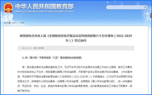 中工网讯 据教育部官网消息,近日,教育部制定发布了《全国教育系统开展法治宣传教育的第八个五年规划(2021-2025年)》,教育部有关负责人就《全国教育系统开展法治宣传教育的第八个五年规划(2021-2025年)》答记者问。