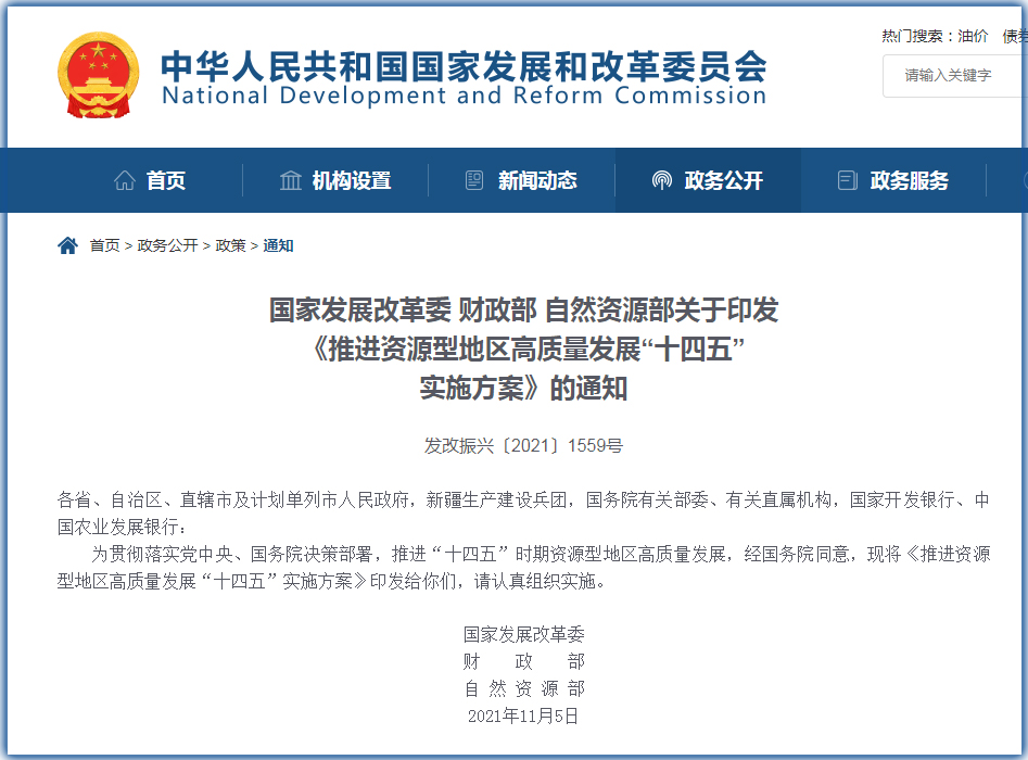 中工网讯 据国家发展与改革委网站消息,近日,为贯彻落实党中央、国务院决策部署,推进“十四五”时期资源型地区高质量发展,经国务院同意,国家发展改革委、财政部、自然资源部联合印发《推进资源型地区高质量发展“十四五”实施方案》。