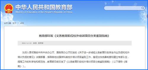 中工网讯 据教育部网站消息,为深入贯彻落实中共中央办公厅、国务院办公厅印发的《关于进一步减轻义务教育阶段学生作业负担和校外培训负担的意见》决策部署,指导各地加强学科类校外培训项目鉴别工作,督促加快完善制度和建立专家队伍,提高工作的科学性和规范性,近日,教育部印发了《义务教育阶段校外培训项目分类鉴别指南》(以下简称《指南》)。