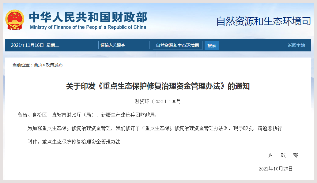 中工网讯 据财政部官网消息,为加强重点生态保护修复治理资金管理,财政部修订了《重点生态保护修复治理资金管理办法》(以下简称为《办法》)。