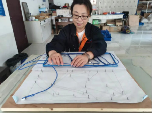 (现任女工班班长王济燕在做线把)