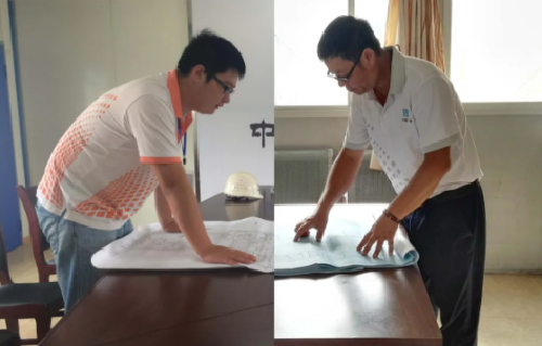 (父子隔空同看图纸)
