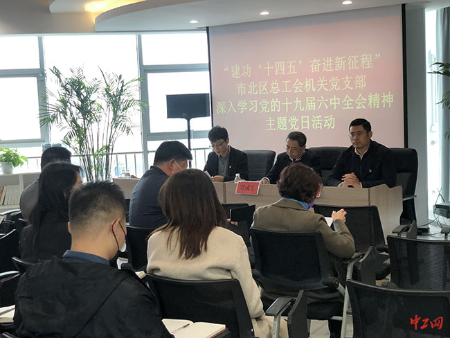 中工网讯 11月17日,山东省青岛市市北区总工会机关党支部在时代国际广场新时代区域共享职工之家举办“建功‘十四五’奋进新征程”主题党日活动,机关支部党员与八大群体、新就业形态劳动者及劳模党员代表等基层职工一起,深入学习贯彻党的十九届六中全会精神。