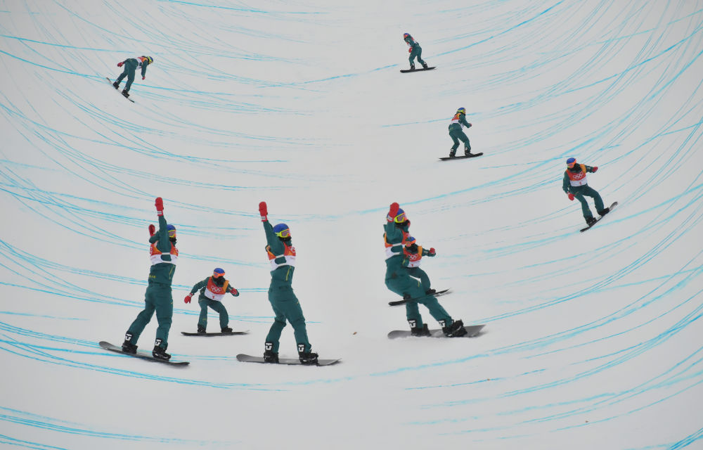 澳大利亚选手斯科蒂·詹姆斯在单板滑雪男子U型场地比赛中(多重曝光)。新华社记者吕小炜摄