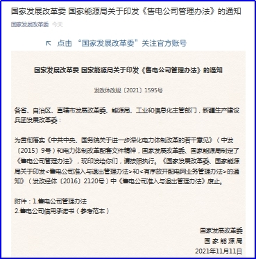 据国家发展改革委微信公众号消息,为贯彻落实《中共中央、国务院关于进一步深化电力体制改革的若干意见》(中发〔2015〕9号)和电力体制改革配套文件精神,国家发展改革委、国家能源局制定了《售电公司管理办法》(发改体改规〔2021〕1595号)。
