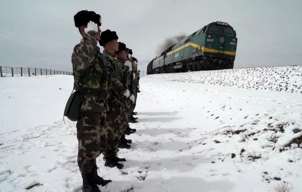 新华社拉萨11月24日电(卢东方、蒋国语)“敬礼——”皑皑白雪中,第一次参加天路巡逻的武警西藏总队那曲支队执勤三中队战士张骏在班长张凡的带领下举起右手,对着青藏铁路上呼啸而过的列车庄严地敬着军礼。在列车轰鸣的汽笛声中,张凡和张骏的身边,上等兵王宏俊也完成了自己天路巡逻的最后一个军礼。悠长的汽笛见证了高原战位又一次的接续传承,这也是张凡来到执勤三中队以来第10次主持天路交接。