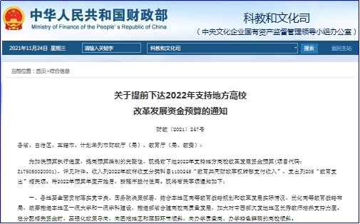 中工网讯 据财政部网站消息,为加快预算执行进度,提高预算编制的完整性,财政部、教育部提前下达2022年支持地方高校改革发展资金预算(项目代码:Z175050020001)。收入列2022年政府收支分类科目1100245“教育共同财政事权转移支付收入”,支出列205“教育支出”相关项。待2022年预算年度开始后,按程序拨付使用。现将有关事项通知如下: