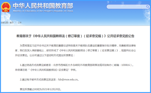 中工网讯 据教育部网站消息,11月29日,教育部发布了关于《中华人民共和国教师法(修订草案)(征求意见稿)》公开征求意见的公告。