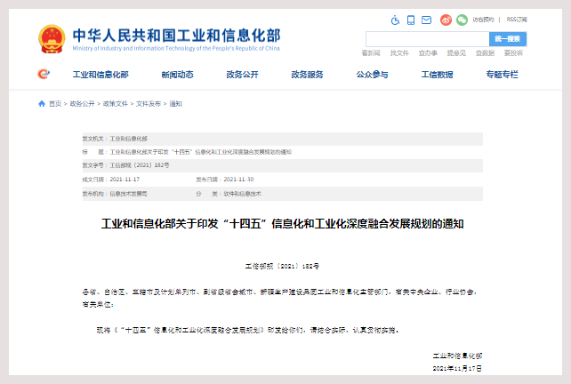 中工网讯 据工信部网站消息,为深入贯彻落实党中央、国务院关于深化新一代信息技术与制造业融合发展的决策部署,持续做好两化深度融合这篇大文章,根据《中华人民共和国国民经济和社会发展第十四个五年规划和2035年远景目标纲要》,工业和信息化部编制了《“十四五”信息化和工业化深度融合发展规划》(以下简称《规划》)。