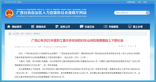 中工网讯 据广西壮族自治区人力资源和社会保障厅网站消息,近日,广西壮族自治区人力资源和社会保障厅、广西壮族自治区财政厅、国家税务总局广西壮族自治区税务局联合印发《关于公布2021年度职工基本养老保险和失业保险缴费基数上下限标准的通知》(桂人社发〔2021〕117号)。