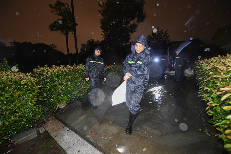 张新志在暴雨天气中拽紧缆索,保护红船免受狂风损害。新华社发 受访者供图(资料图)