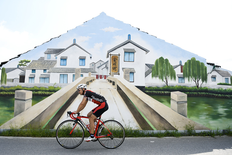 2021年9月17日,嘉善县西塘镇金明村,群众骑车经过绘上了江南新农村彩绘的房屋。新华社发 王振宇摄 嘉兴日报供图