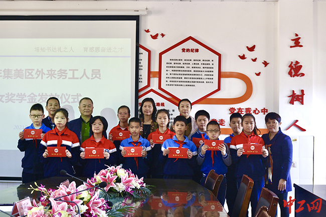 中工网讯 12月1日上午,福建厦门集美区外来务工子女奖学金发放仪式在厦门市集美区新村小学举行。厦门市集美区人大常委会党组成员、区总工会主席黄云茜,区总工会常务副主席黄国栋,区教育工会常务副主席陈红等出席仪式。