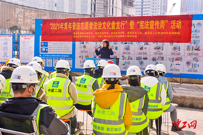 此次活动的主题是“2021年青年普法志愿者法治文化盘龙行”暨“宪法宣传周”进工地活动,由昆明盘龙区委政法委员会、盘龙区司法局、盘龙区总工会、盘龙区人力资源和社会保障局、盘龙区法学会主办,盘龙区拓东街道总工会、中建二局云南分公司昆明春之眼项目部承办的。
