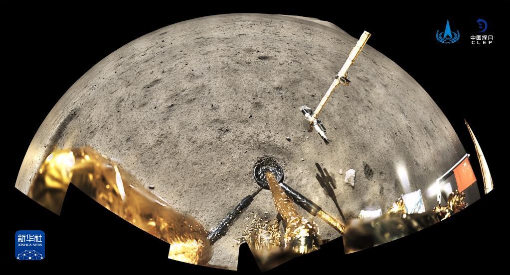 2020年12月4日,国家航天局公布了探月工程嫦娥五号探测器在月球表面国旗展示的照片。嫦娥五号着陆器和上升器组合体全景相机环拍成像,五星红旗在月面成功展开,此外图像上方可见已完成表取采样的机械臂及采样器。新华社发(国家航天局供图)