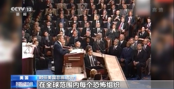 时任美国总统 布什:我们的反恐战争始于“基地”组织。但不止于此,在全球范围内每个恐怖组织,被发现、被终结、被击败前,(反恐战争)都不会结束。