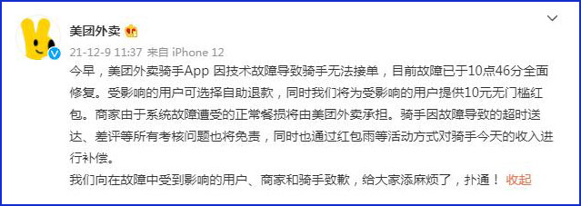 中工网讯 12月9日,美团外卖官方微博发文称,今早,美团外卖骑手App因技术故障导致骑手无法接单,目前故障已于10点46分全面修复。受影响的用户可选择自助退款,同时我们将为受影响的用户提供10元无门槛红包。商家由于系统故障遭受的正常餐损将由美团外卖承担。骑手因故障导致的超时送达、差评等所有考核问题也将免责,同时也通过红包雨等活动方式对骑手今天的收入进行补偿。