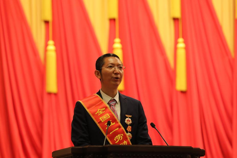 图为梁骏作为全国五一劳动奖章获奖代表发言。受访者供图