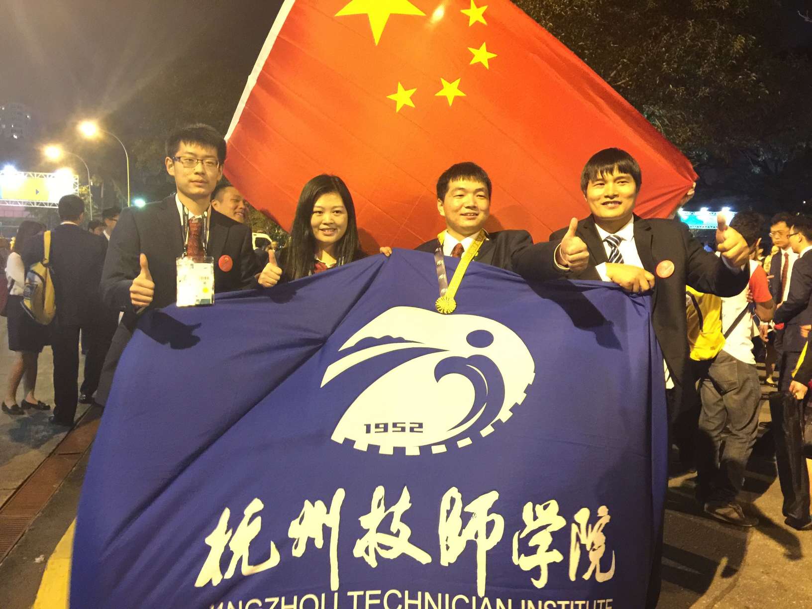 图为杨金龙在第43届世赛获得世界冠军后合影。受访者供图
