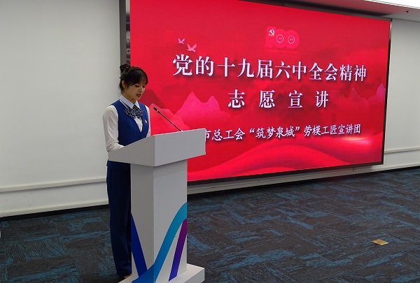 日前,山东济南市总工会“筑梦泉城”劳模工匠宣讲团到济南市新旧动能转换起步区,开展党的十九届六中全会精神志愿宣讲。这标志着济南市总工会宣讲党的十九届六中全会精神全面启动。