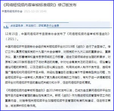 中工网讯 据“中国网络视听协会”微信公众号消息,12月15日,中国网络视听节目服务协会发布了《网络短视频内容审核标准细则》(2021)。