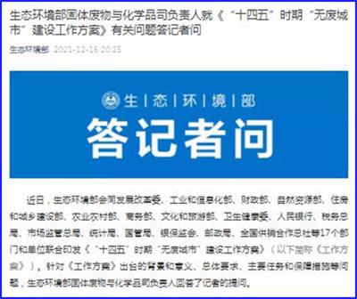 中工网讯 据生态环境部微信公众号消息,近日,生态环境部会同发展改革委、工业和信息化部、财政部、自然资源部、住房和城乡建设部、农业农村部、商务部、文化和旅游部、卫生健康委、人民银行、税务总局、市场监管总局、统计局、国管局、银保监会、邮政局、全国供销合作总社等17个部门和单位联合印发《“十四五”时期“无废城市”建设工作方案》(以下简称《工作方案》)。针对《工作方案》出台的背景和意义、总体要求、主要任务和保障措施等问题,生态环境部固体废物与化学品司负责人答记者问。