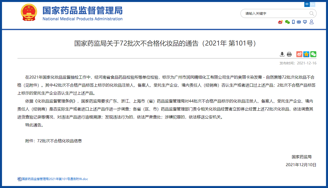 中工网讯 据国家药监局网站消息,在2021年国家化妆品监督抽检工作中,经河南省食品药品检验所等单位检验,标示为广州市润民精细化工有限公司生产的奥丽卡染发膏-自然黑等72批次化妆品不合格(详见相关链接)。其中42批次不合格产品标签上标示的化妆品注册人、备案人、受托生产企业、境内责任人(经销商)否认生产或者进口过上述产品;2批次不合格产品标签上标示的受托生产企业否认生产过上述产品。