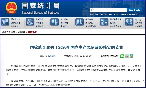 中工网讯 据国家统计局网站消息,按照我国国内生产总值(GDP)核算和数据发布制度规定,年度GDP核算包括初步核算和最终核实两个步骤。近日,根据国家统计局统计年报、财政部财政决算和有关部门年度财务资料等,国家统计局对2020年GDP数据进行了最终核实,主要结果如下: