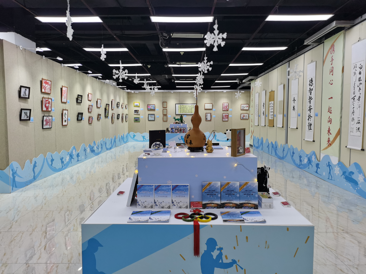 在艺术作品展示区内,有序陈列了来自全市职工及职工志愿者的300余件抒发助力冬奥情怀的实物作品,内容涉及剪纸、书法、绘画、摄影、手工等,全面展现了首都职工的创造力和奋进力量。除实物作品外,职工志愿助力冬奥建设成果以及冬奥赛时信息也一并展示。