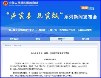 中工网讯 据教育部网站消息,12月22日,教育部召开新闻发布会,围绕加强中小学“五项管理”工作介绍“我为群众办实事”实践活动成效。教育部表示,“五项管理”中作业、睡眠、手机三项管理工作取得积极成效。