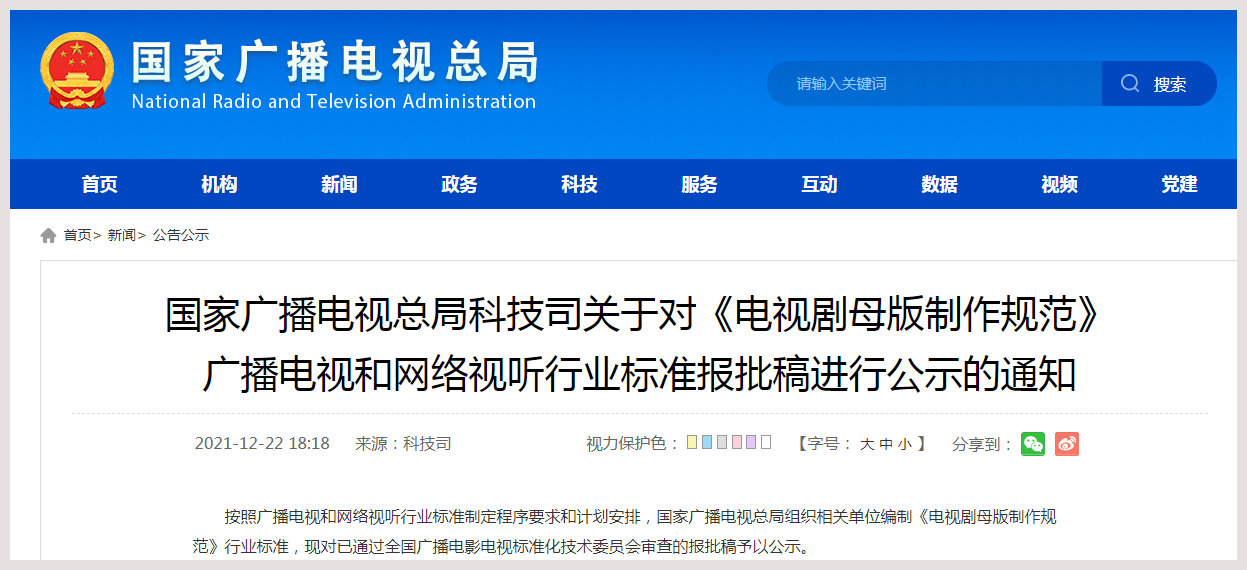中工网讯 据国家广播电视总局网站消息,按照广播电视和网络视听行业标准制定程序要求和计划安排,国家广播电视总局组织相关单位编制《电视剧母版制作规范》(以下简称《规范》)行业标准,现对已通过全国广播电影电视标准化技术委员会审查的报批稿予以公示。
