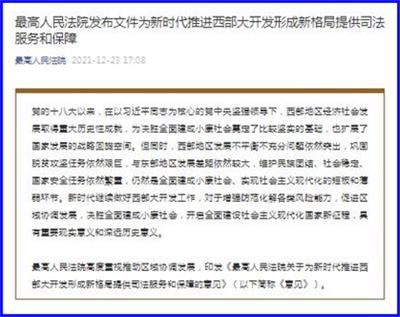 中工网讯 据最高人民法院微信公众号消息,最高人民法院高度重视推动区域协调发展,印发《最高人民法院关于为新时代推进西部大开发形成新格局提供司法服务和保障的意见》(以下简称《意见》)。