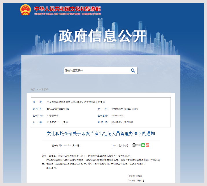 中工网讯 据文旅部网站消息,为加强演出经纪人员队伍建设和管理,促进演出市场繁荣健康有序发展,近期,我部对《演出经纪人员管理办法》(以下简称《管理办法》)进行了修订。