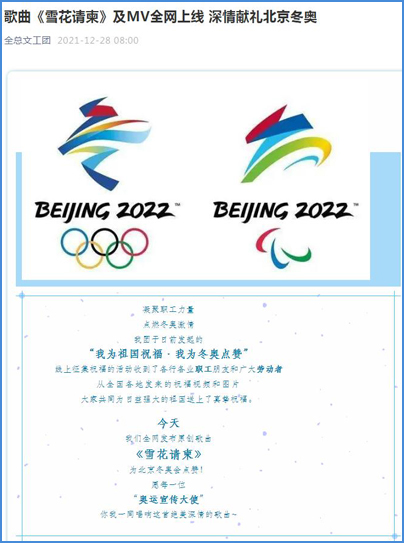 12月28日,全总文工团发布原创歌曲《雪花请柬》为北京冬奥会点赞!