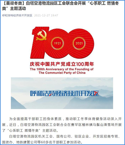 中工网讯 据呼和浩特经济技术开发区微信公众号消息,为全面提高干部职工的身体素质,推动职工冬季体育健身活动深入开展,近日,内蒙古呼和浩特白塔空港物流园区工会联合会在赛罕区榆林镇马鬃山滑雪场开展了“心系职工 燃情冬奥”主题活动。