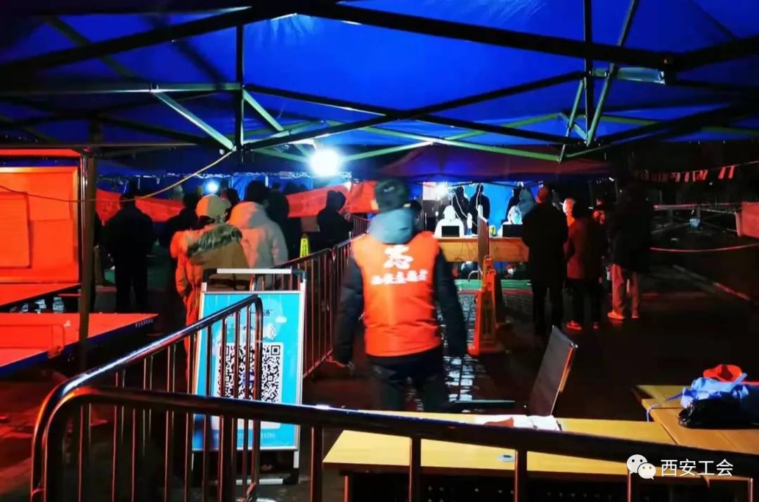 陕西省建设工会与中建安装华西公司西安片区共同组成26名志愿者服务队,冒雪赴西安市莲湖区青年路街道莲四社区,协助该社区近5万人核酸检测现场秩序维护、扫码测温、信息录入等工作,携手“工”克时艰。
