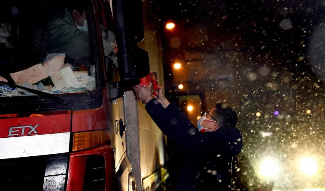12月25日20时许,西安下着小雪,在欣桥农产品物流中心,西安市物流行业工会联合会给运送生活物资的货车司机送去口罩、消毒液等防疫物资。日前,西安市总工会为市物流行业工会联合会拨付5万元专项资金,用于慰问疫情期间运输防疫物资的货车司机,为他们送去温暖和关爱。