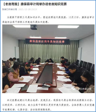中工网讯 据张家口市审计局微信公众号消息,为提高干部职工冬奥知识水平,营造浓厚迎冬奥氛围,近日,康保县审计局组织全局干部职工开展迎冬奥知识竞赛。