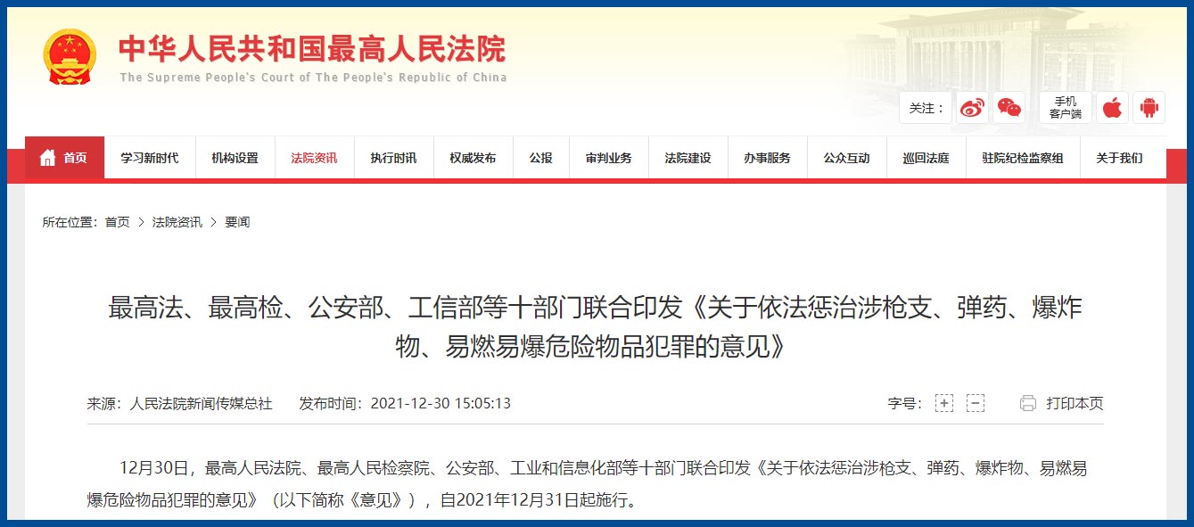 中工网讯 据最高人民法院网站消息,12月30日,最高人民法院、最高人民检察院、公安部、工业和信息化部等十部门联合印发《关于依法惩治涉枪支、弹药、爆炸物、易燃易爆危险物品犯罪的意见》(以下简称《意见》),自2021年12月31日起施行。