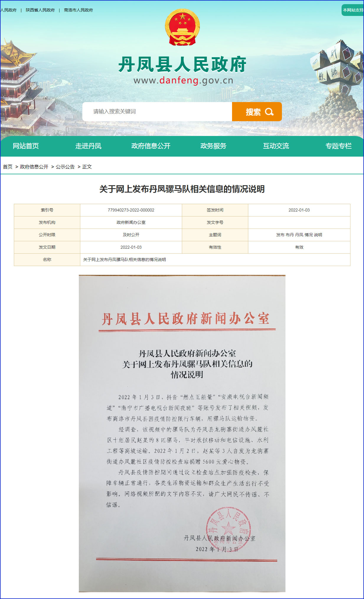 中工网讯 据丹凤县人民政府官方网站消息,1月3日,陕西省商洛市丹凤县人民政府新闻办公室发布关于网上发布丹凤骡马队相关信息的情况说明。