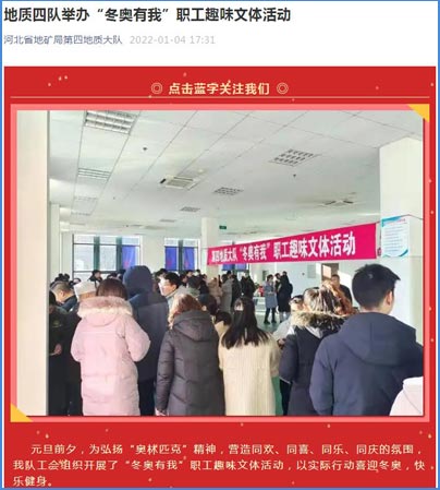 中工网讯 据河北省地矿局第四地质大队微信公众号消息,元旦前夕,为弘扬“奥林匹克”精神,营造同欢、同喜、同乐、同庆的氛围,河北省地矿局第四地质大队工会组织开展了“冬奥有我”职工趣味文体活动,以实际行动喜迎冬奥,快乐健身。