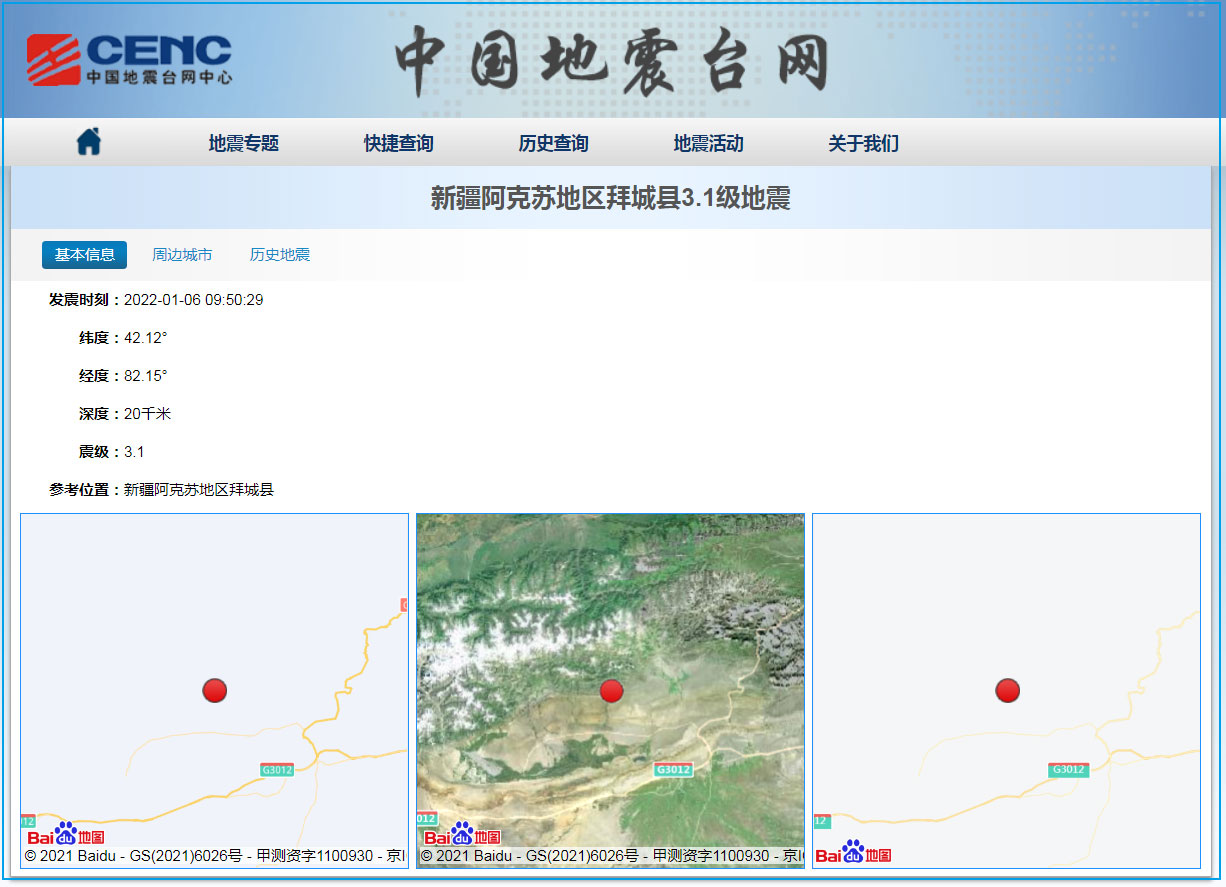 中工网讯 据国家地震台网站消息,中国地震台网正式测定:1月6日09时50分在新疆阿克苏地区拜城县(北纬42.12度,东经82.15度)发生3.1级地震,震源深度20千米。