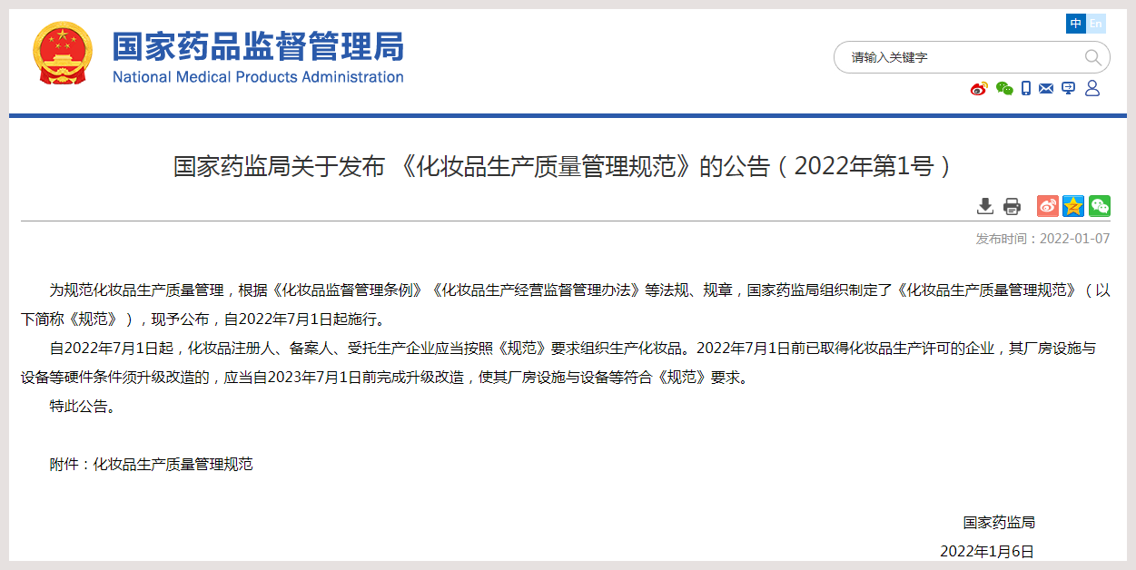 中工网讯 据国家药监局网站消息,为规范化妆品生产质量管理,根据《化妆品监督管理条例》《化妆品生产经营监督管理办法》等法规、规章,国家药监局组织制定了《化妆品生产质量管理规范》(以下简称《规范》),现予公布,自2022年7月1日起施行。